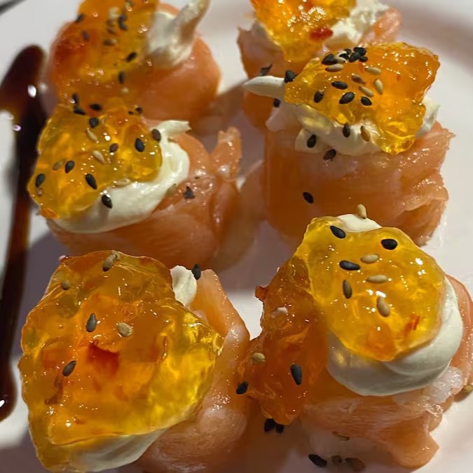 8 unidades de Dyos de Geleia de pimenta com salmão cru envolto no arroz, cream cheese e geleia de pimenta por cima.