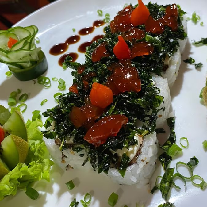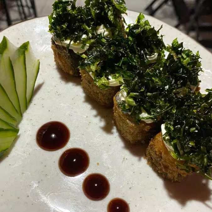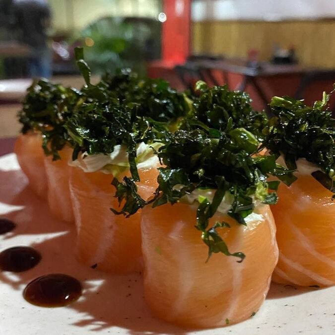 8 unidades de Dyos de Couve com salmão cru envolto no arroz, cream cheese e couve frita por cima.