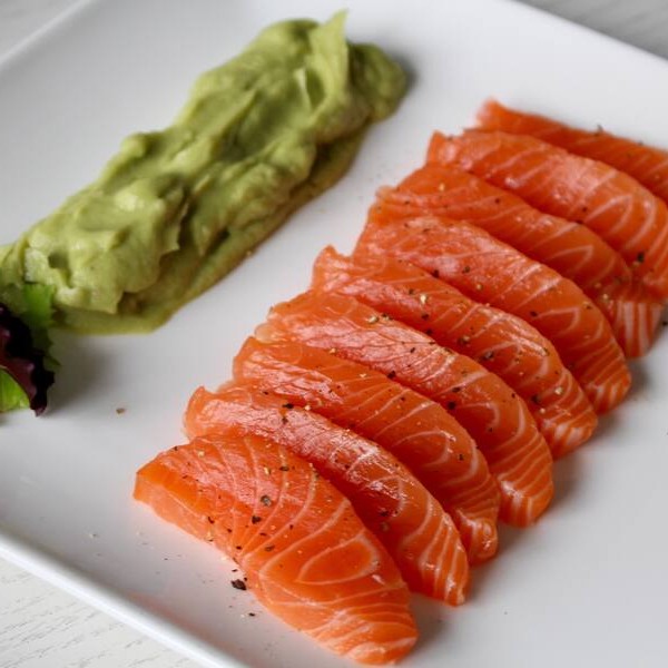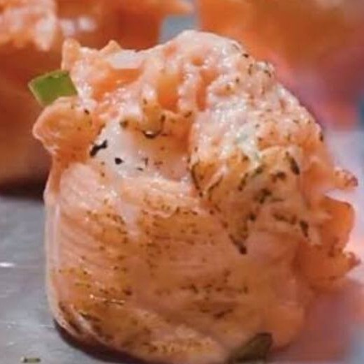 8 unidades de joe de salmao e rucula envolto em uma lamina de salmao com cream cheese, rucula e alho marinado no azeite.