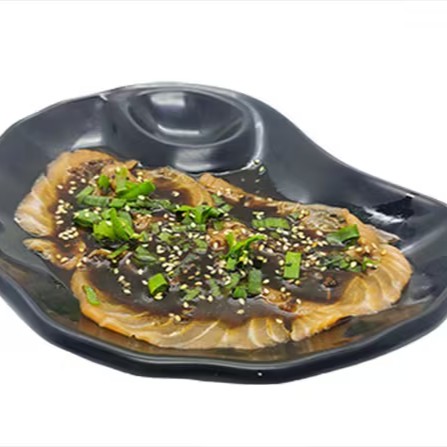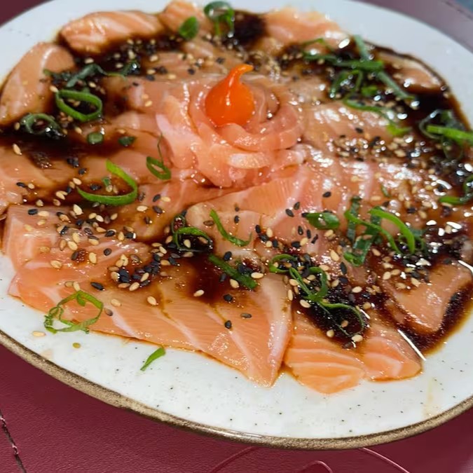 8 á 10 fatias de salmão cru ao molho ponzo, finalizado com gergelim e cebolinha.