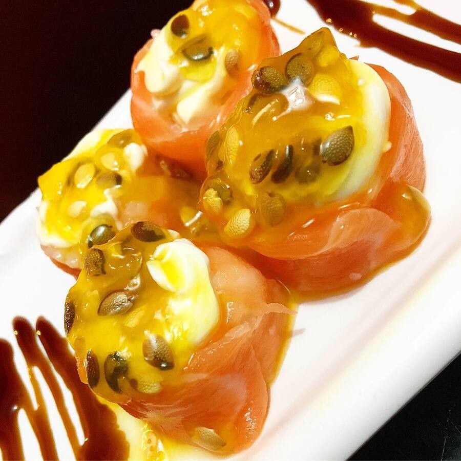 8 unidades de Dyos de Maracujá com salmão cru envolto no arroz, cream cheese e maracujá por cima.