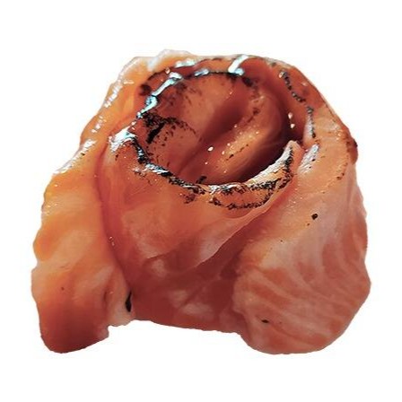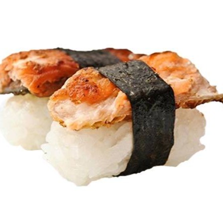4 unidades de sushi de salmão grelhado envolto com alga nori, arroz e gergelim.