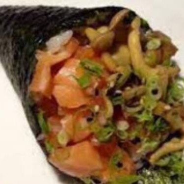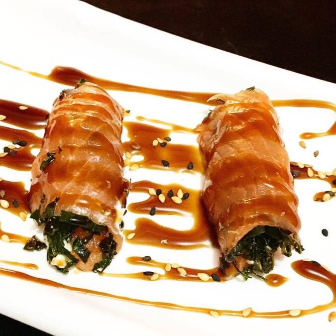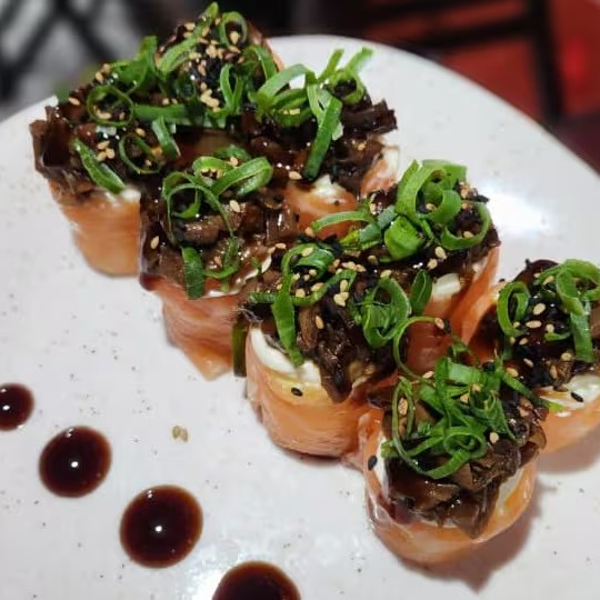 Shimeji,cream chesse e cebolinha envolto de uma lamina de salmao finalizado com tare e gergilim.