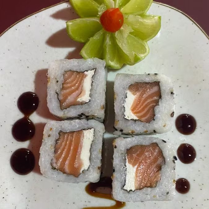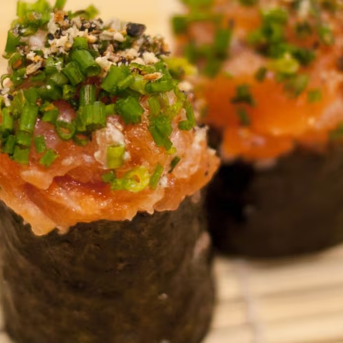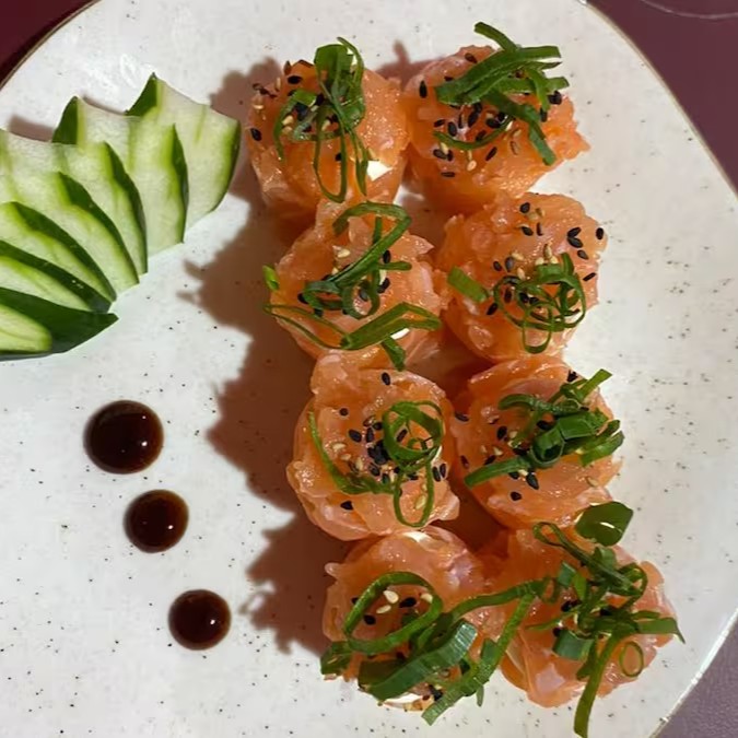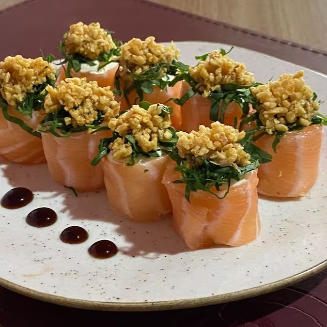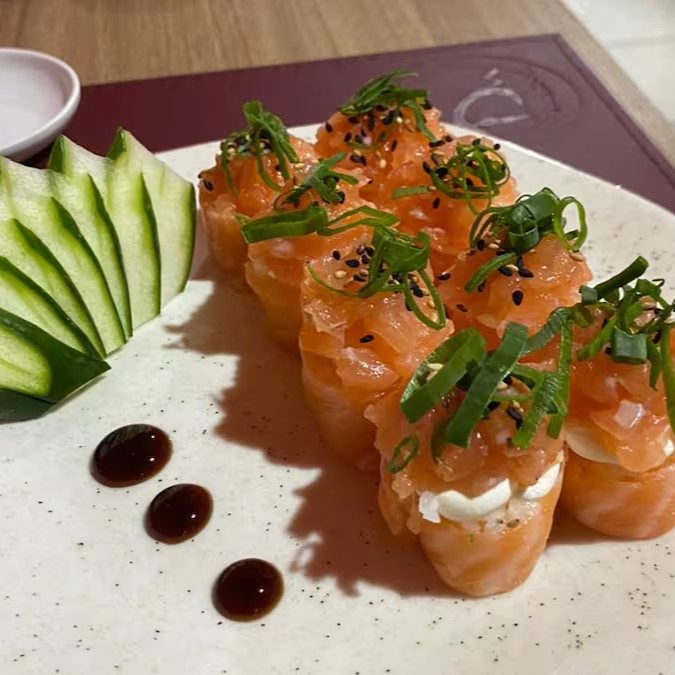 8 unidades de Dyos de Salmão cru, envolto no arroz, cream cheese, maçaricado, finalizado com gergilim, cebolinha e molho tare