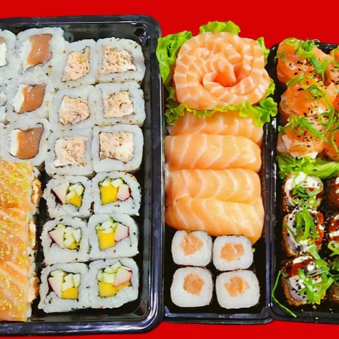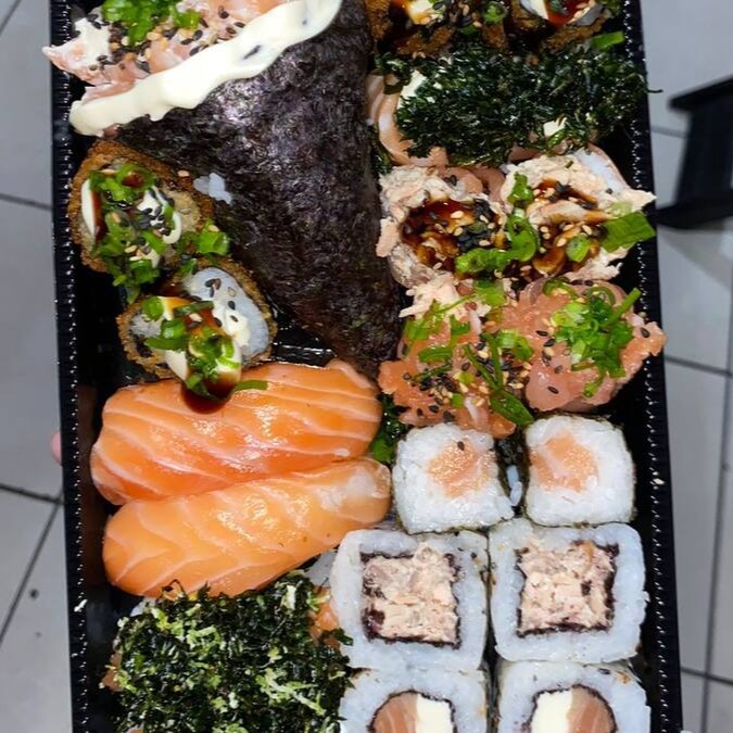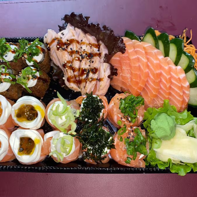 6 sashimi, 6 uramaki skin, 6 uramaki california, 6 uramaki salmão grelhado, 6 uramaki salmão cru, 6 hot roll, 6 dyo salmão, 4 niguiri skin, 4 hossomaki
