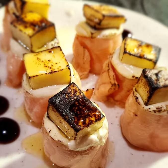 8 unidades de joe de salmao cru envolto no arroz, rechado com cream cheese, queijo coalho maçaricado e finalizado com mel