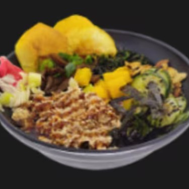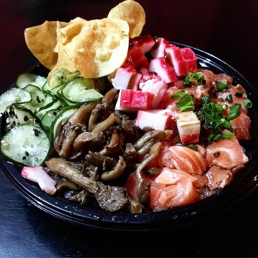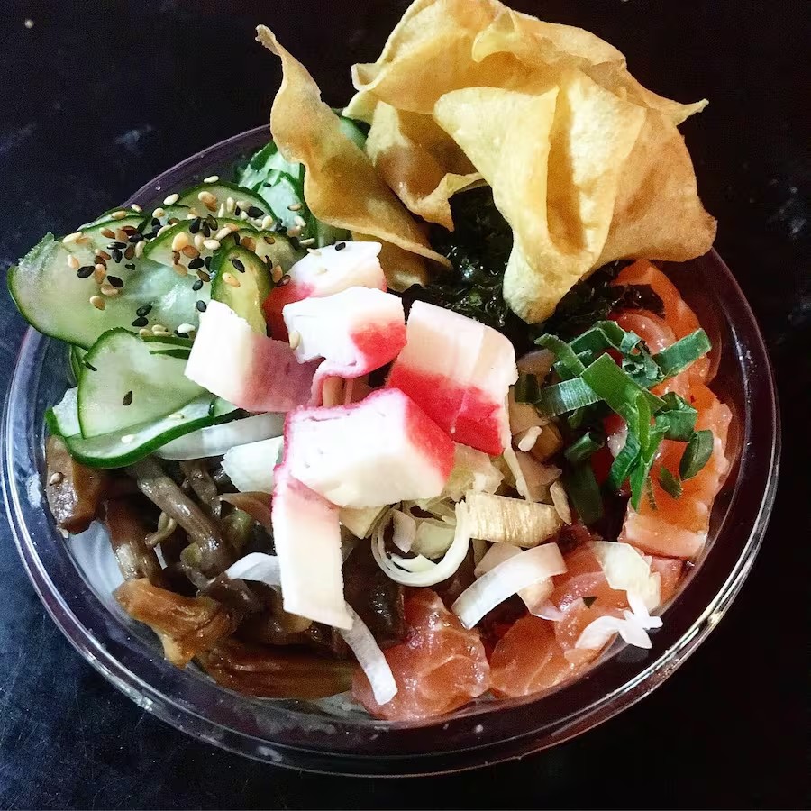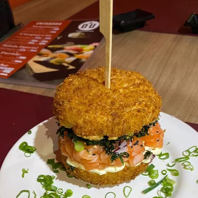 Arroz empanado e frito, molho da casa, cebola roxa, couve crispy frita, cream chesse, gergilim, cebolinha e salmao