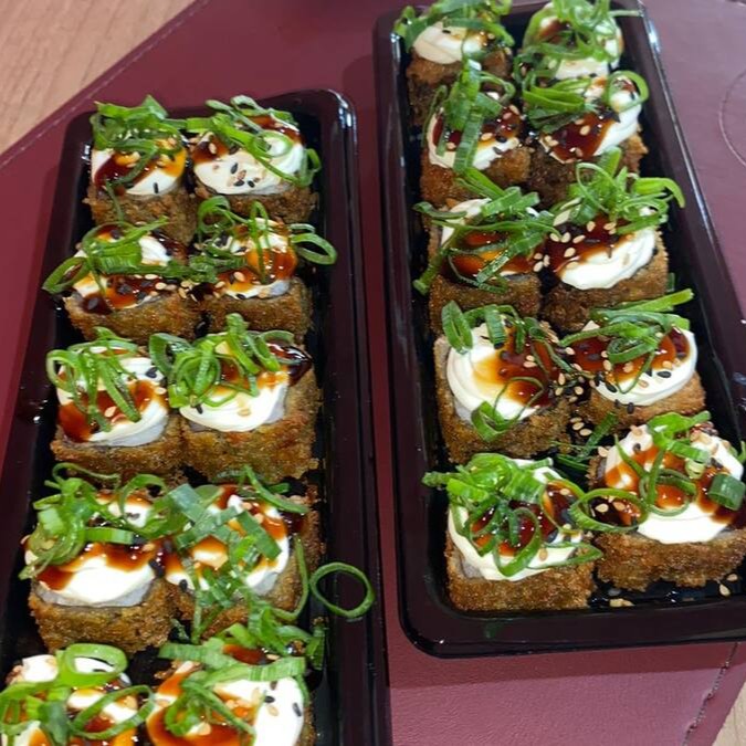 20 unidades de Hot Roll de Salmão. Sushi de salmão grelhado, frito e finalizado com cream cheese, cebolinha, gergelim e molho tarê.