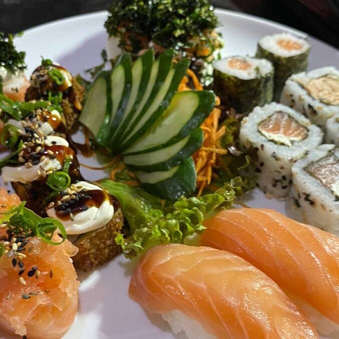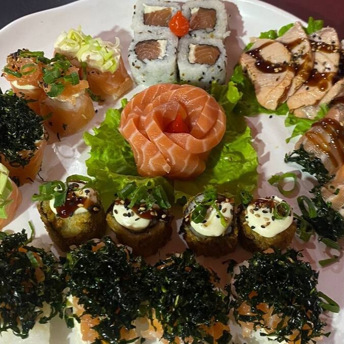15 sashimis, 12 hossomakis, 14 uramakis, 15 hot rolls, 12 dyos de sua escolha e 6 niguiris