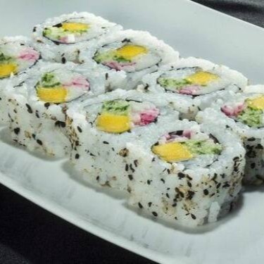 8 unidades de sushi de pepino, kani e manga envolto com alga nori, arroz e gergelim.