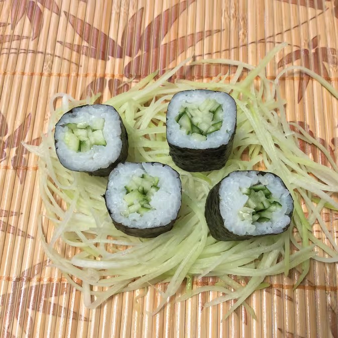 8 unidades de sushi com pepino envolto com alga nori e arroz.
