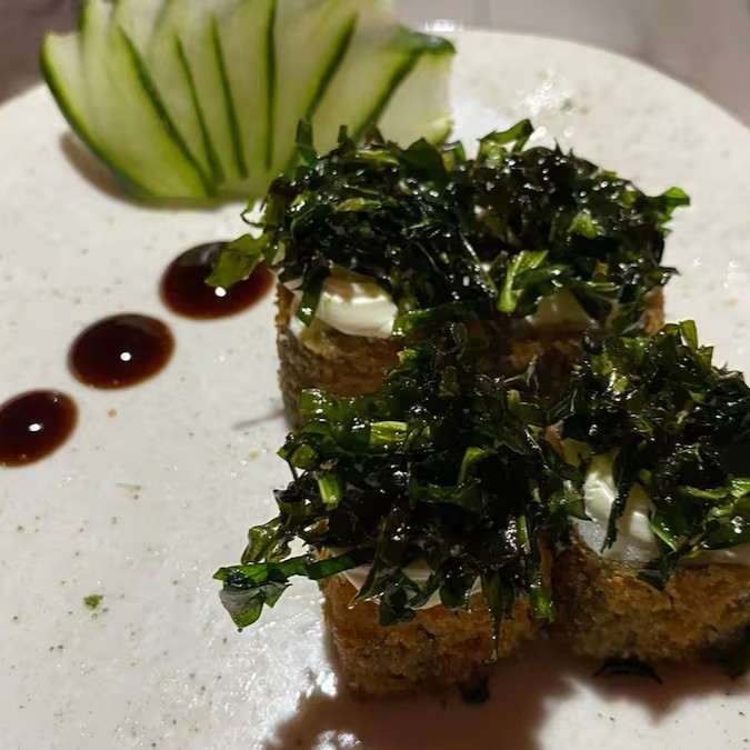 Salmao grelhado com cream chesse, envolto de alga, arroz e gergilim, finalizado com cream chesse, couve crispy frita e geleia de pimenta