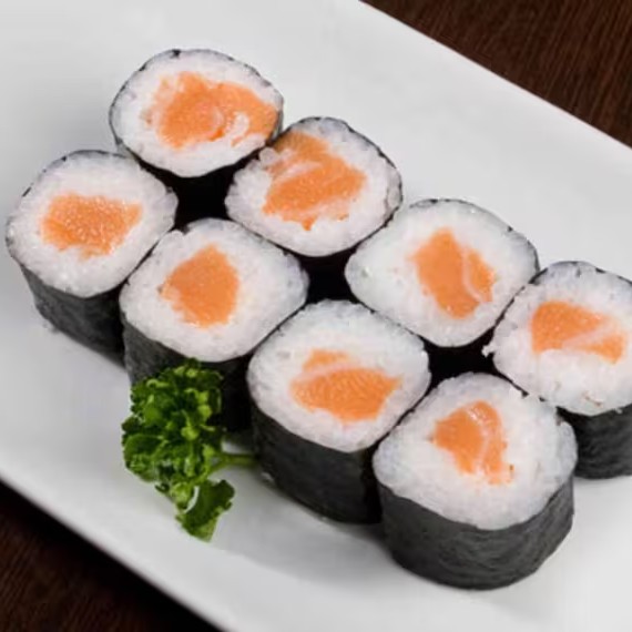 8 unidades de sushi de salmão cru envolto com alga nori e arroz.