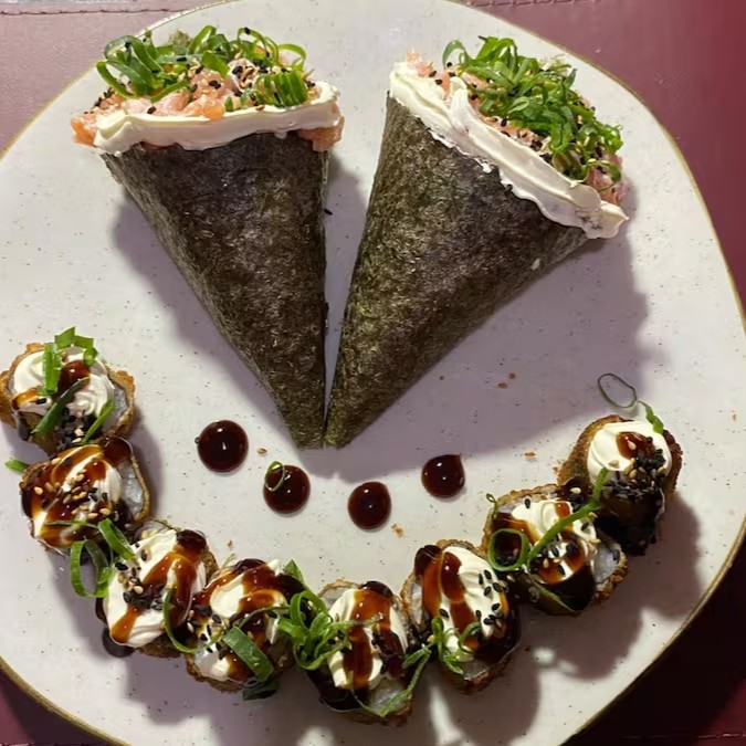 1 Temaki hot roll, 8 unidades de Hot roll tradicional (salmao, cebolinha e cream chesse)