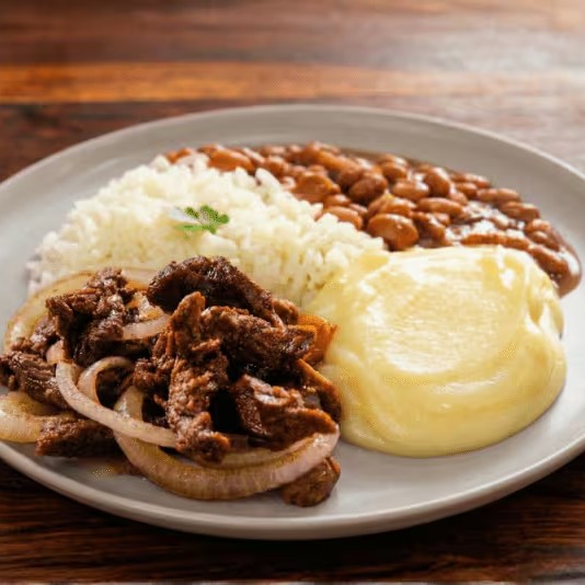 Marmitex de Isca de Carne Acebolada - acompanha: Arroz, Feijão, Batata Souté