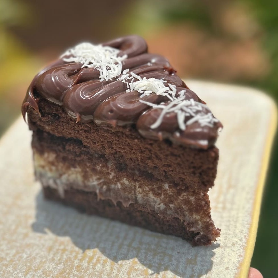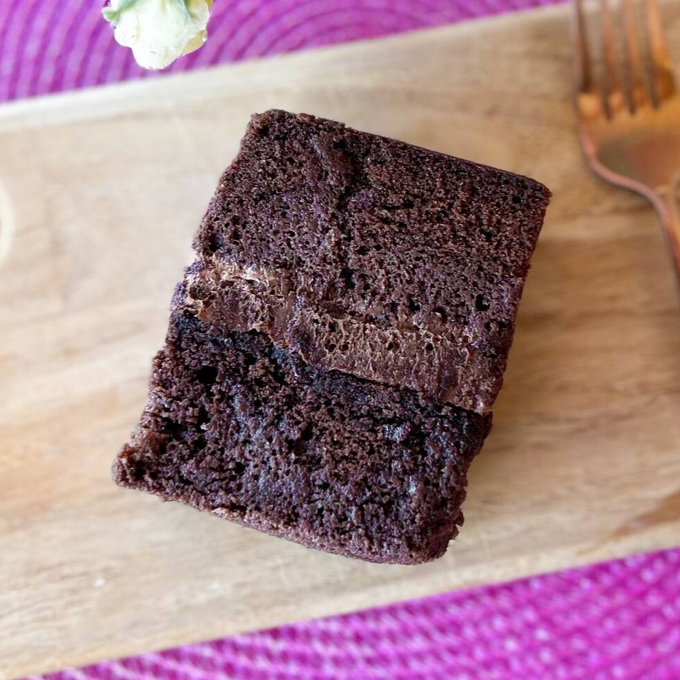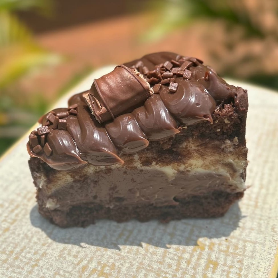 Um pedaço maravilhoso de brownie de chocolate, úmido e macio, coberto com o recheio de sua preferencia. Venha se deliciar