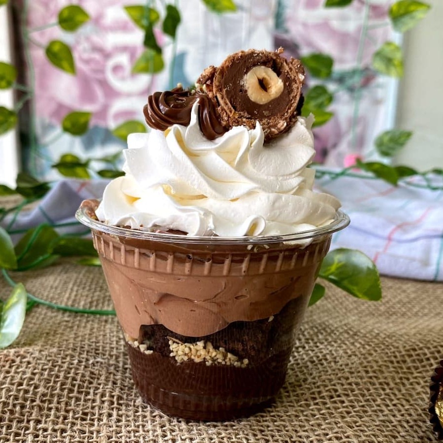 Cestinha banhada no chocolate, que leva em sua cobertura um cremoso brigadeiro ou brigadeiro branco, sempre à sua escolha. Dentro possui pedaços do nosso maravilhoso brownie e para finalizar, uma generosa camada de Nutella.