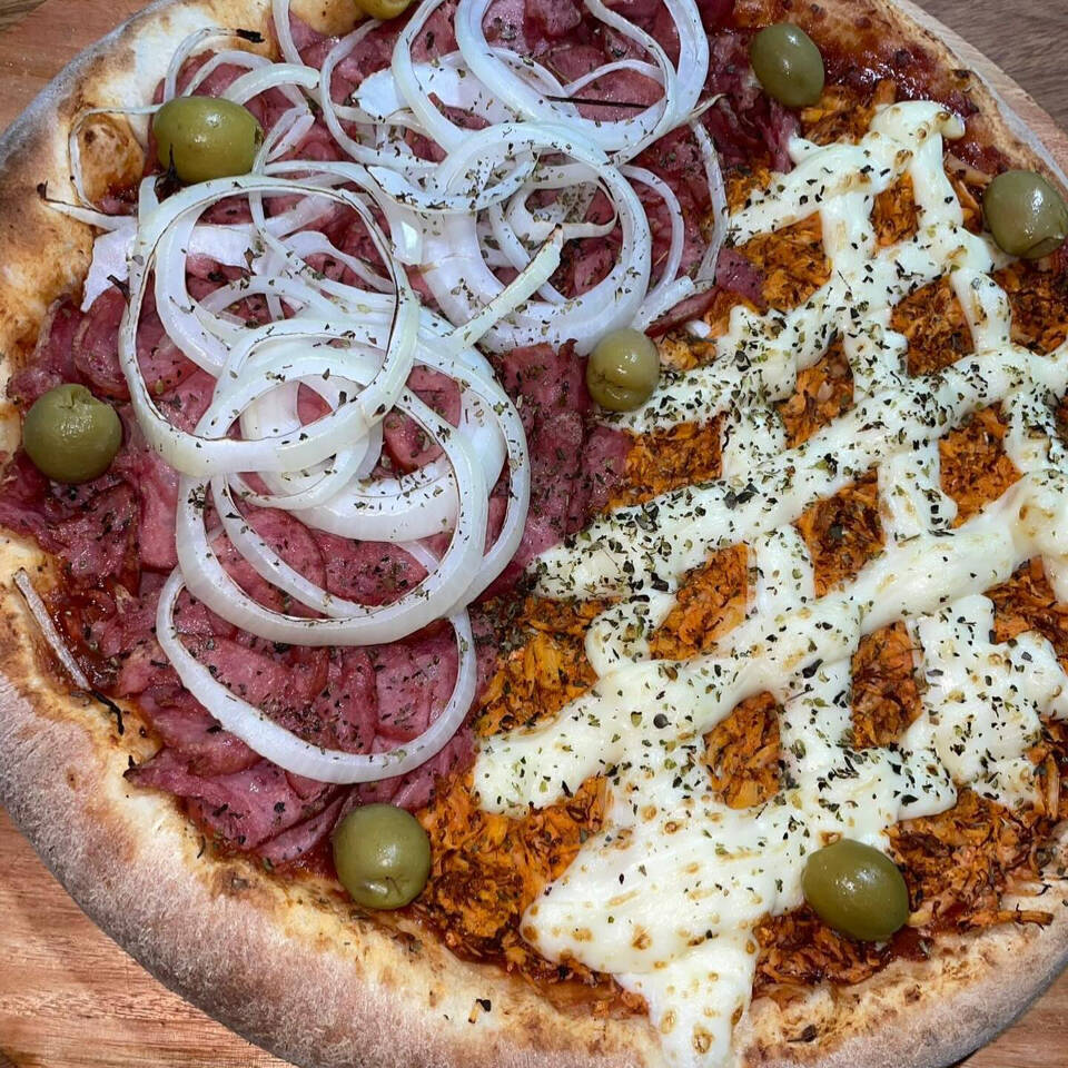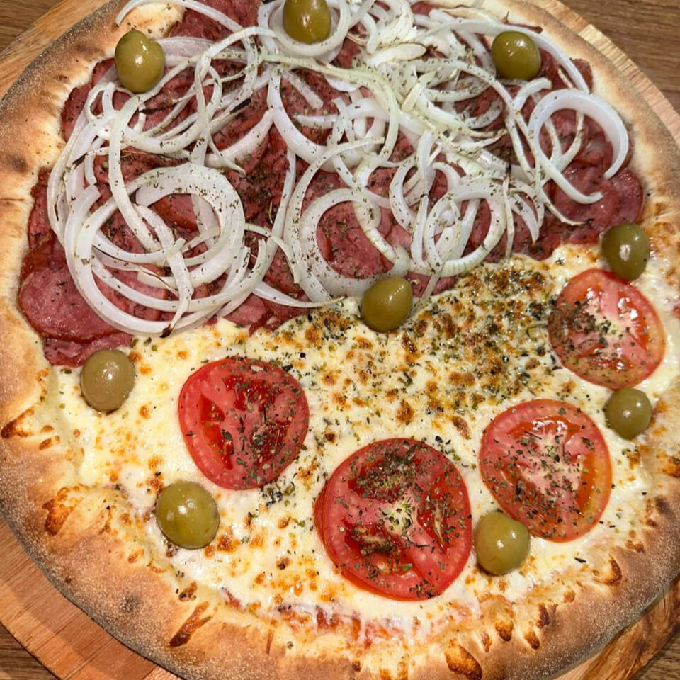 1/2 Calabresa Mussarela, Calabresa e Cebola 1/2 muusarela, tomate +refri a sua escolha gratis
