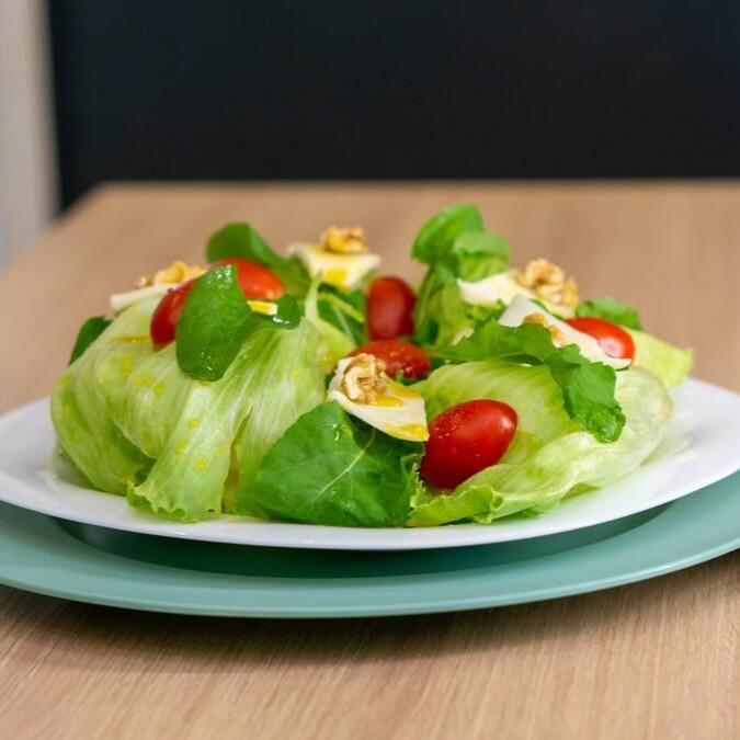 Mix de folhas frescas, lascas de queijo minas padrão, tomate cereja, nozes, molho de azeite de oliva, mel, mostarda e limão siciliano.
