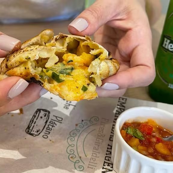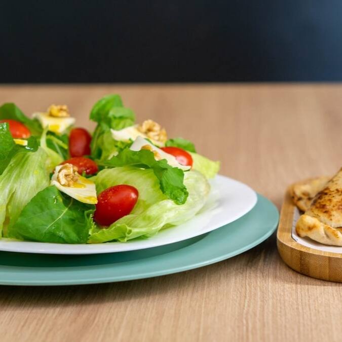 Mix de folhas frescas, lascas de queijo minas padrão, tomate cereja, nozes, molho de azeite de oliva, mel, mostarda e limão siciliano. Acompanha duas empanadas Tradicionais.