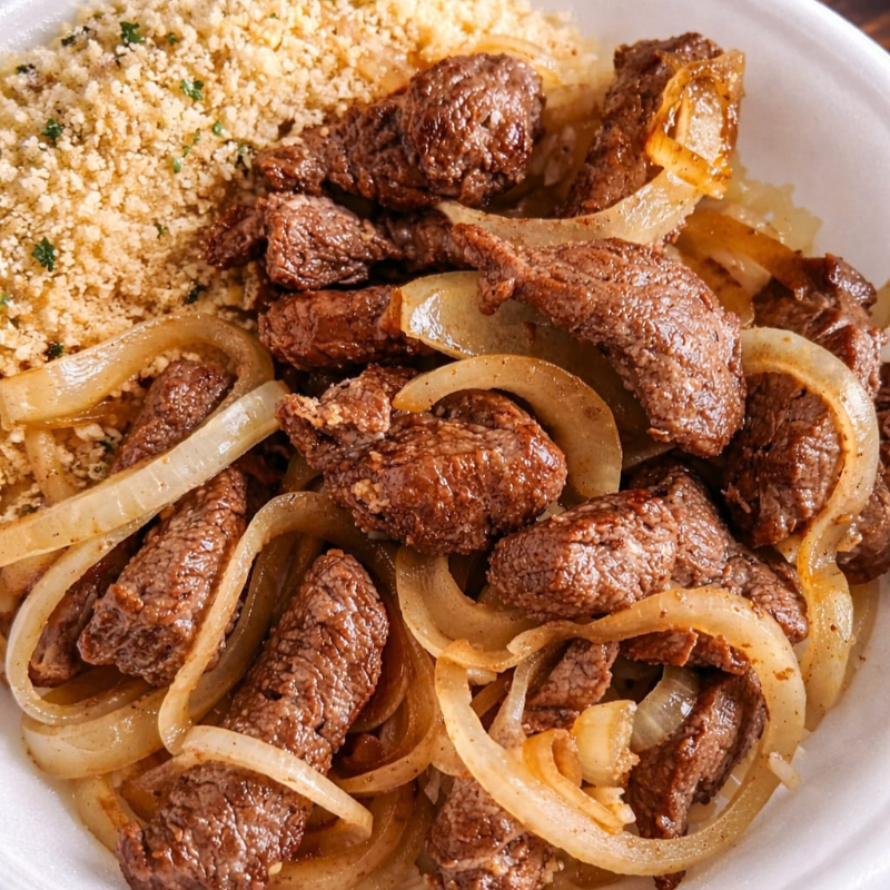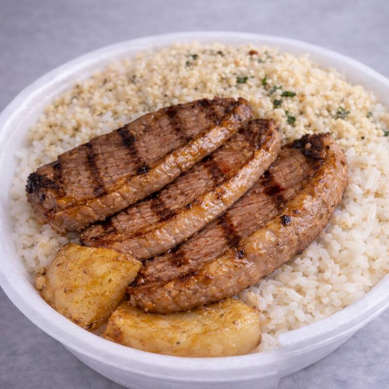 Picanha Fatiada : Acompanha: Arroz, feijão, farofa crocante e mais um acompanhamento á escolha. Marmita M - 750ml