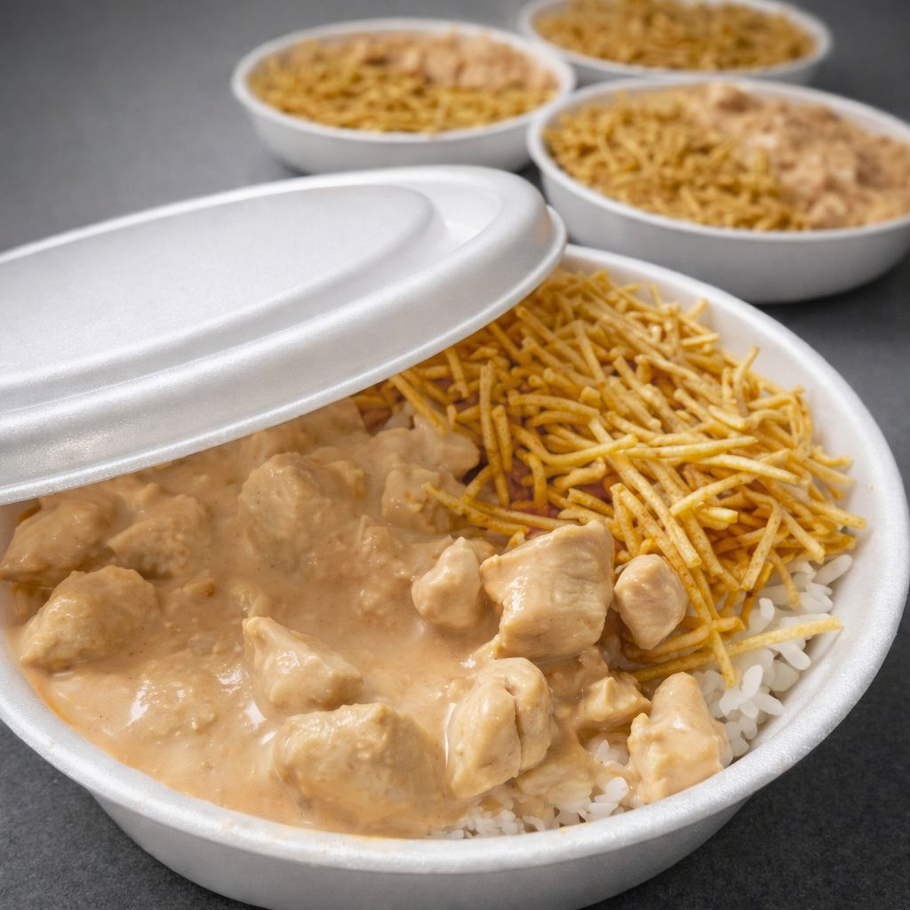 Estrogonofe de frango cremoso finalizado com creme de leite fresco, servido com arroz e batata palha crocante.