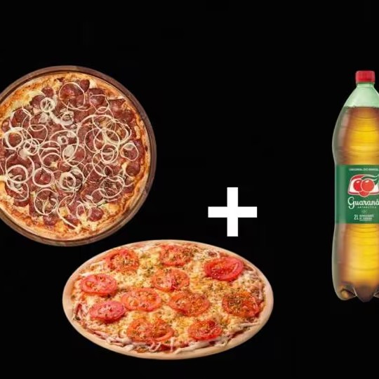 Uma pizza de mussarela uma pizza de calabresa + 1 refri 2litros
