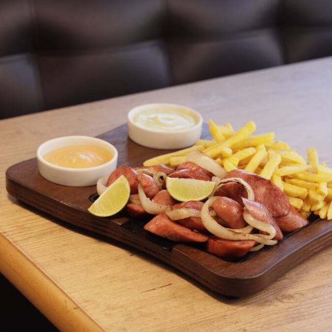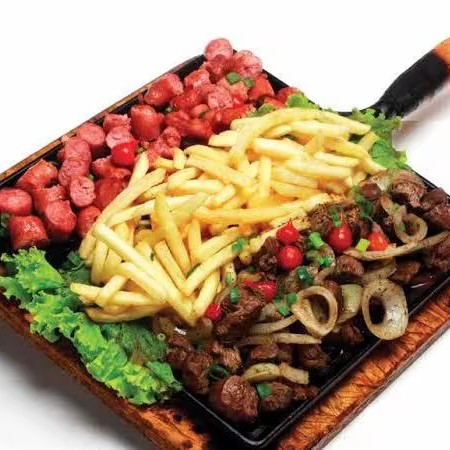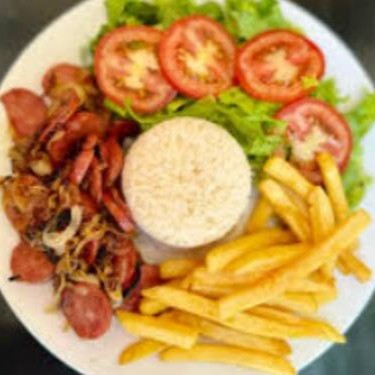 Calabresa acebolada, arroz, feijão, alface, tomate e batata frita.