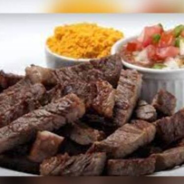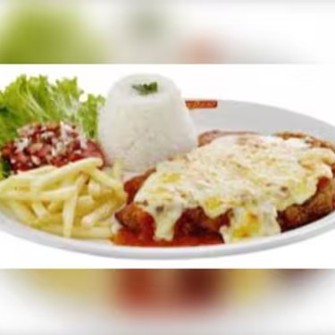 Contra filé, molho de tomate, mussarela,batata, alface, tomate, cebola, arroz e feijão.