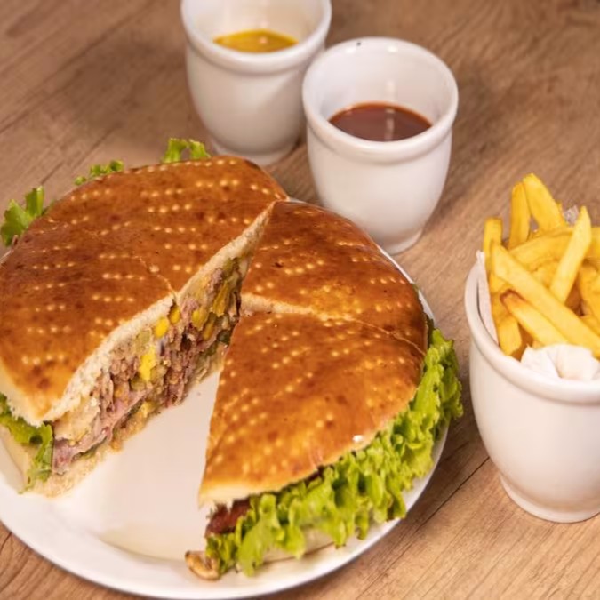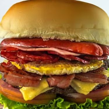 Hambúguer, bacon, frango desfiado, calabresa, ovo , presunto, queijo, maionese,tomate e alface.