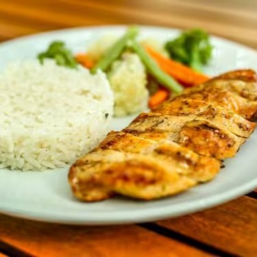Filé de frango grelhado, arroz, feijão, alface, tomate e batata frita.