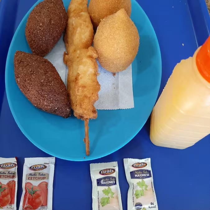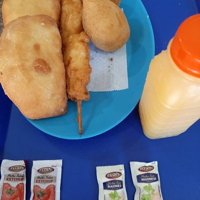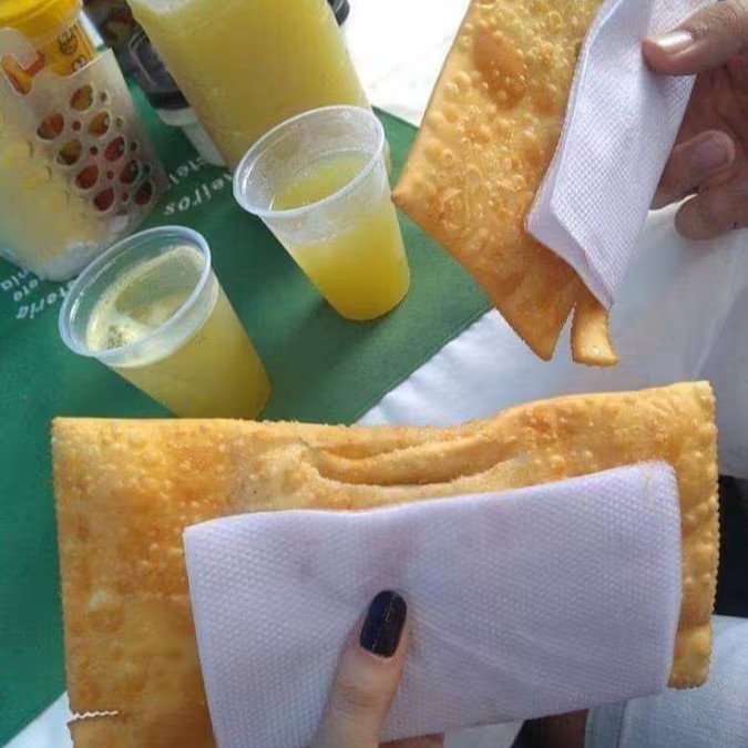 02 coxinhas, 02 kibes, 02 espetos de frango e 01 suco (laranja, caju ou goiaba)