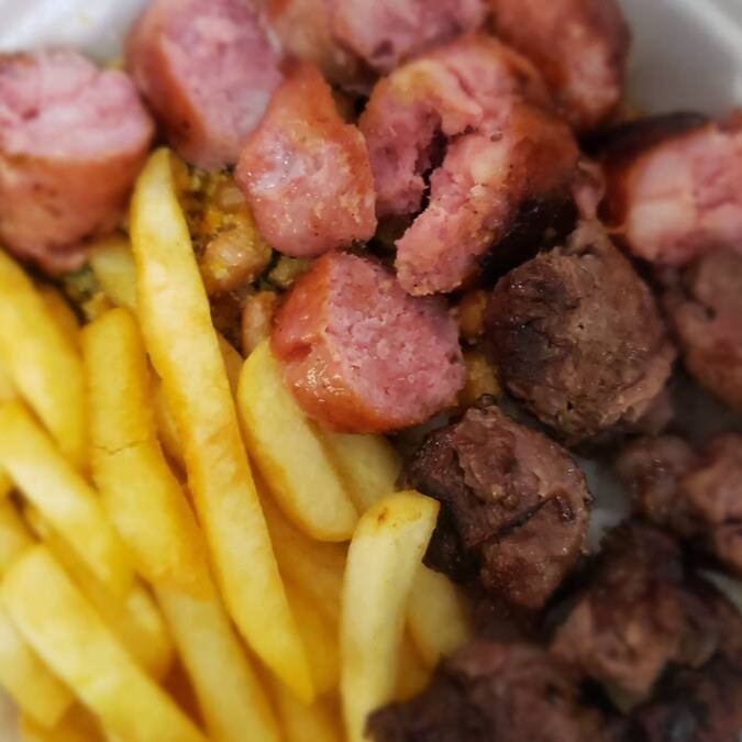Arroz, Feijão Carioca, Carne, Linguiça Toscana, Farofa e Salada
