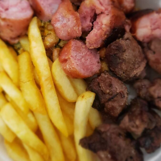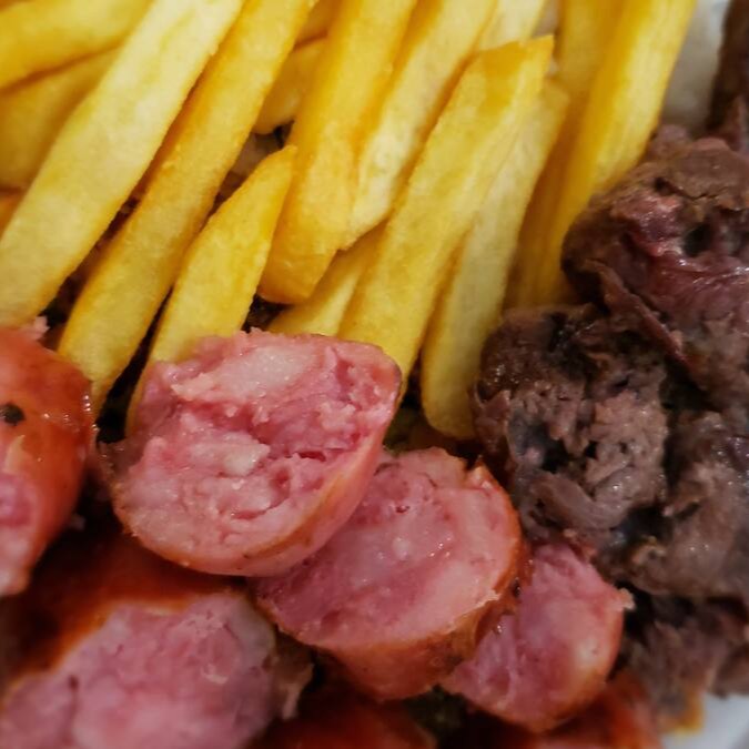 arroz,feijão tropeiro,batata frita,vinagrete,carne e linguiça toscana