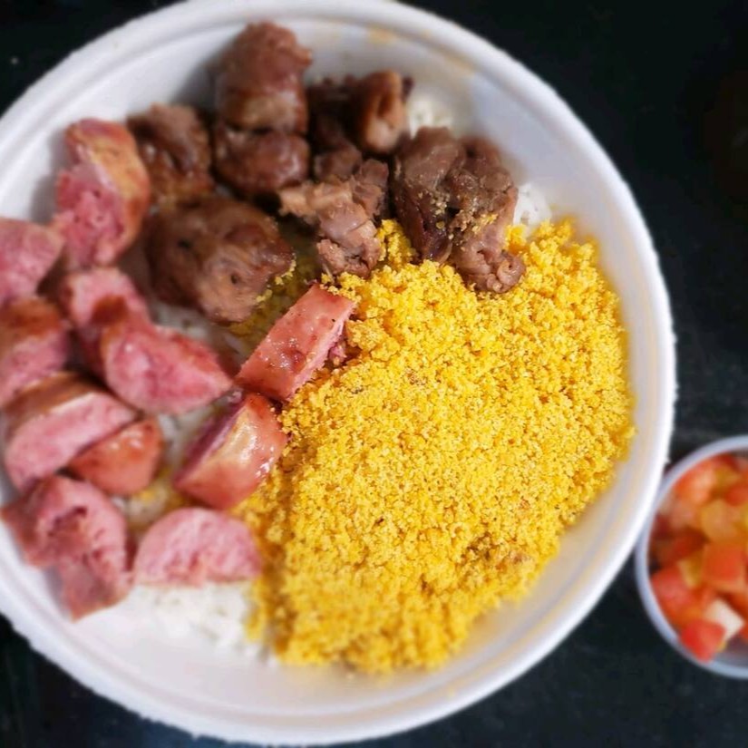 Arroz, Feijão Carioca, Carne,Linguiça Toscana,Farofa e Salada