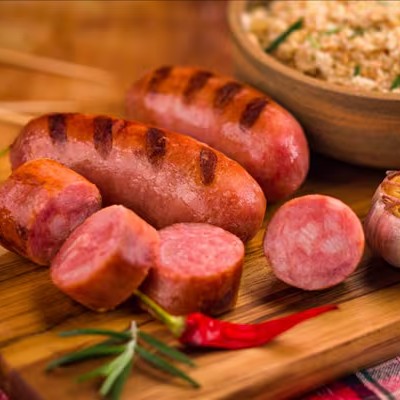 Arroz, feijão, Vinagrete, molho de alho ,Farofa e Batata Rústica - Linguiça Suína