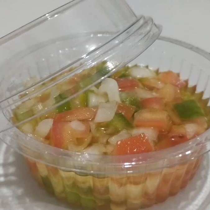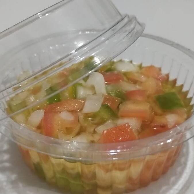 Nosso vinagrete carioca leva azeite, pimentão, tomate, cebola e vinagre, trazendo um sabor único e autêntico do Rio de Janeiro.