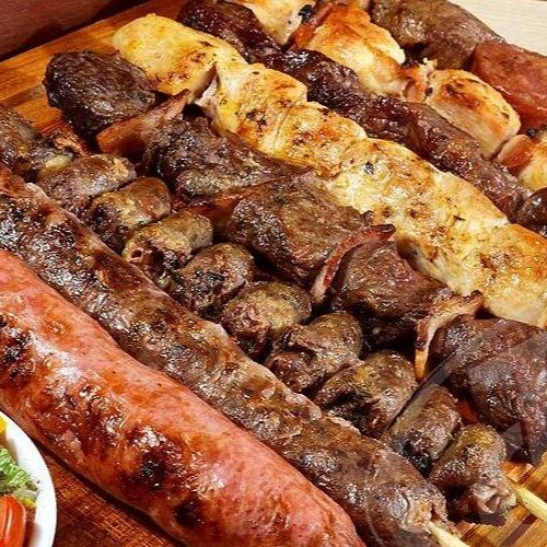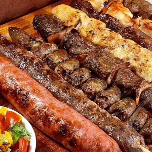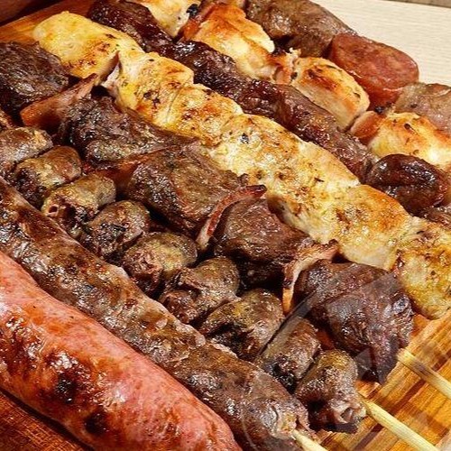 02 Espeto de Carne + 01 Espeto de Coração + 01 Espeto de Linguiça + 01 Espeto Coxinha da Asa + 01 Espeto de Filé da Coxa ( Frango ) + 01 Espeto de Kafta + 01 Pão de Alho + 01 Farofa Pequena + 01 Vinagrete Carioca Pequena.