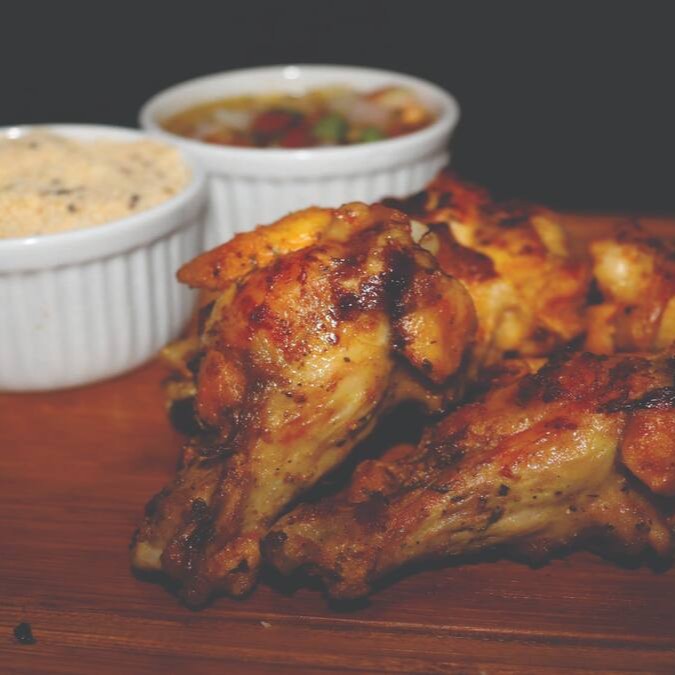 03 Coxinhas da asa, Suculenta, grelhado na brasa com um toque de limão e ervas finas.