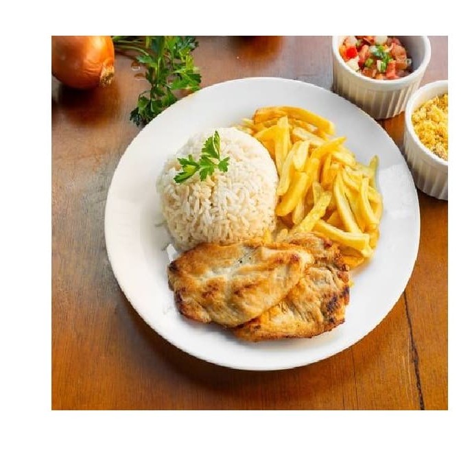Arroz, Feijão, Farofa, Vinagrete, Fritas e Filé de Frango Grelhado