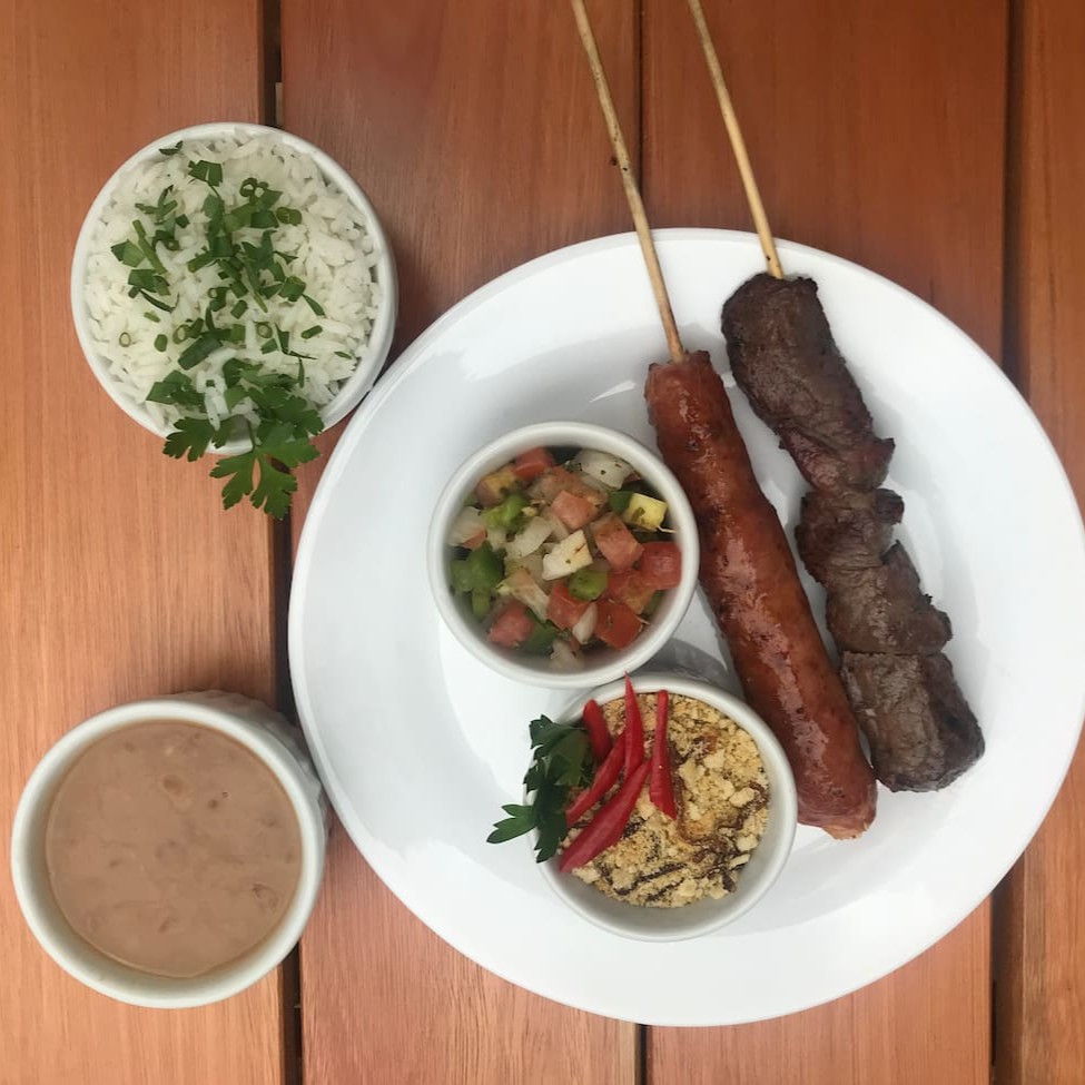 Arroz, feijão, vinagrete e farofa + 2 espetos