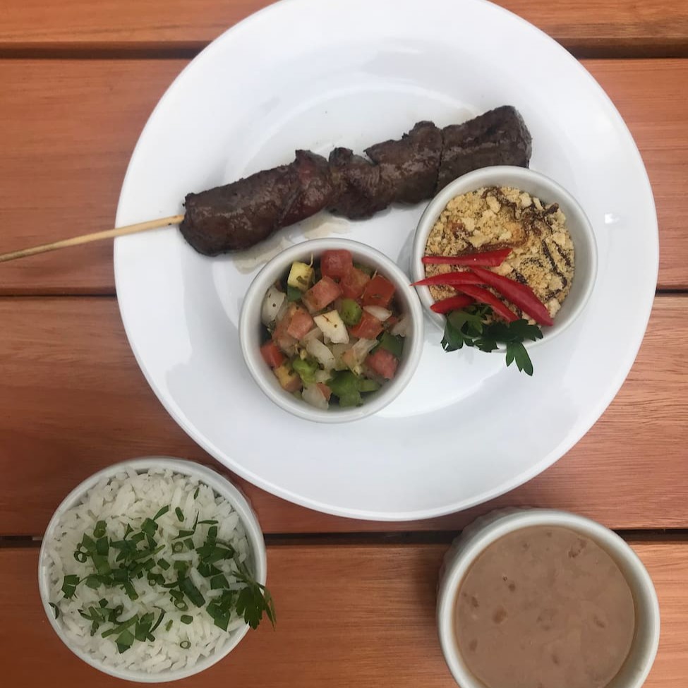 Arroz, feijão, vinagrete, farofa + um espeto a sua escolha.