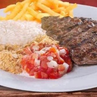 Arroz, Feijão, Farofa, Vinagrete e Contra Filé grelhado c/ fritas - feito na brasa