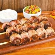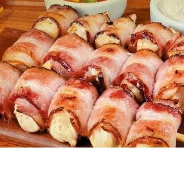 Espeto de medalhão de mandioca (mandioca enrolada no bacon)