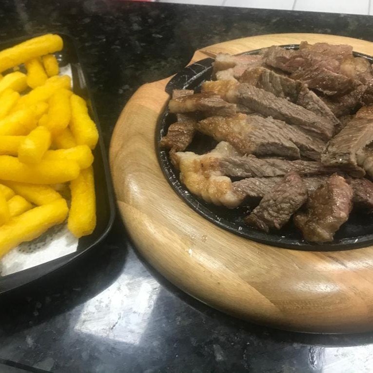 Contra Filé (500g), Arroz, Feijão, fritas, Pão de alho, Farofa e Vinagrete. Serve ate 3 pessoas.
