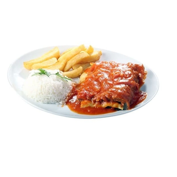 Arroz, frango a parmegiana e fritas