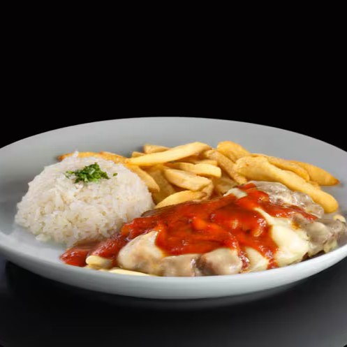 Contra file empanado coberto com queijo e molho de tomate,acompanhado de arroaz,feijao e batata fritas