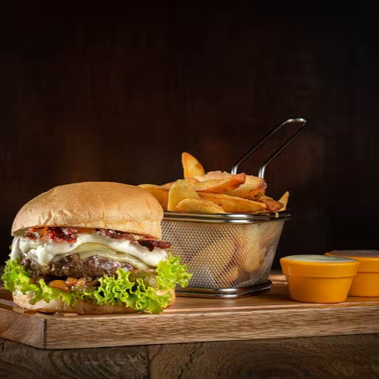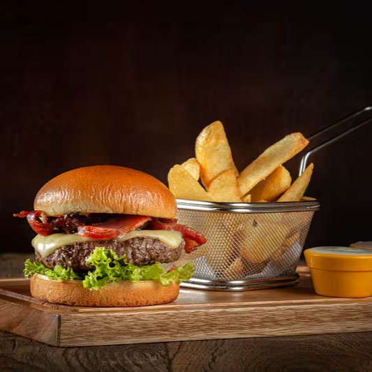 200g de hambúrguer de picanha, pão de brioche, mussarela, vinagrete, bacon e alface + batata rústica.