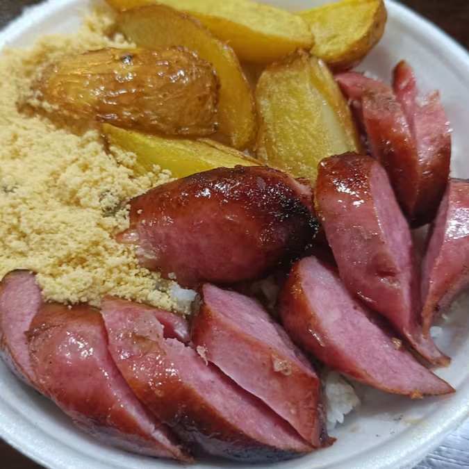 Imagine uma suculenta linguiça toscana, grelhada à perfeição na brasa, exalando um aroma irresistível. Acompanhando, temos um arroz soltinho e brilhante, um feijão caseiro bem temperado que remete aos almoços em família, uma farofa crocante que traz um contraste de texturas delicioso e, por fim, batatas fritas douradas e extremamente crocantes. Tudo isso embalado com todo cuidado e carinho no nosso tradicional Marmitex para você experimentar essa explosão de sabores!