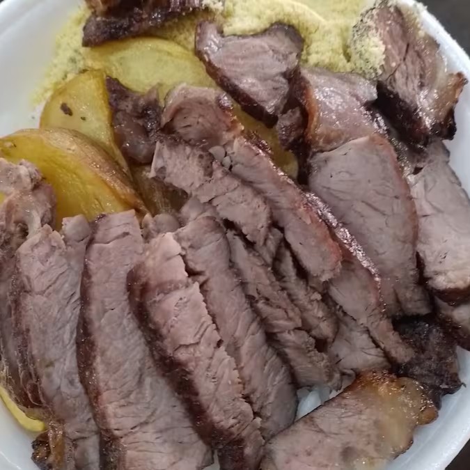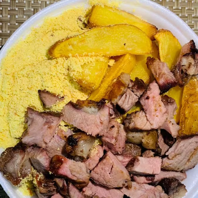 Apresentamos a nossa deliciosa e suculenta Maminha na Brasa (Média). Este prato, perfeitamente preparado na marmitex, é constituído por um arroz soltinho e bem temperado, um feijão encorpado e saboroso, uma farofa crocante e irresistível e, para finalizar, batatas fritas douradas e crocantes. Uma refeição completa que une sabor, qualidade e tradição. Ideal para quem aprecia uma boa carne e não abre mão de acompanhamentos clássicos e deliciosos. Experimente e se encante!